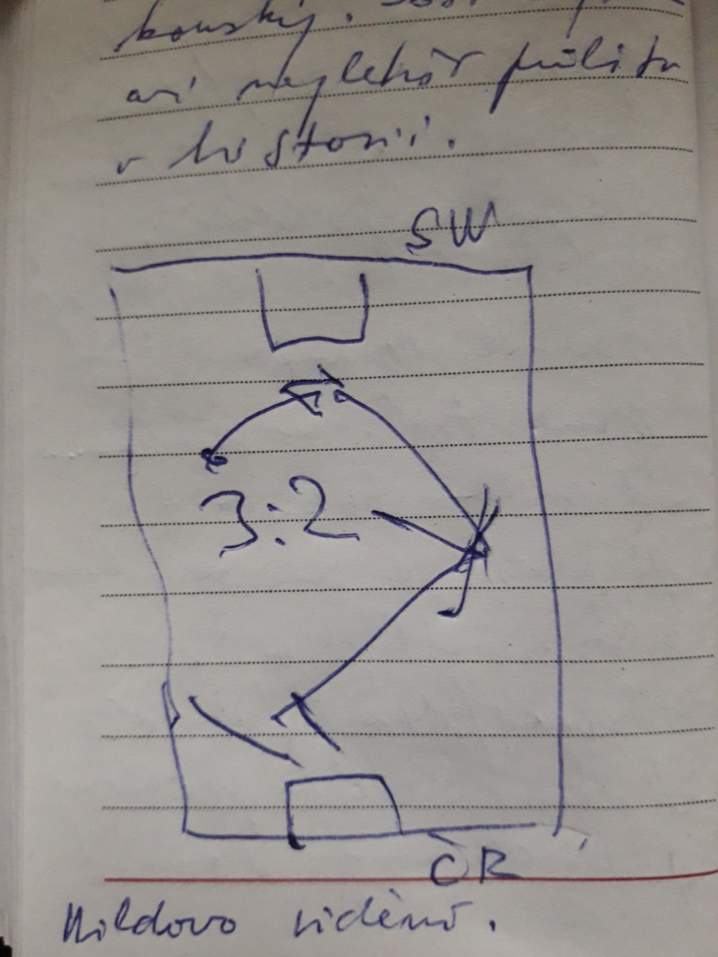 Hokej je zatím 1:2. Náhle mi Wilda vytrhnul zápisník a něco rázně maloval. Měl vidiny.