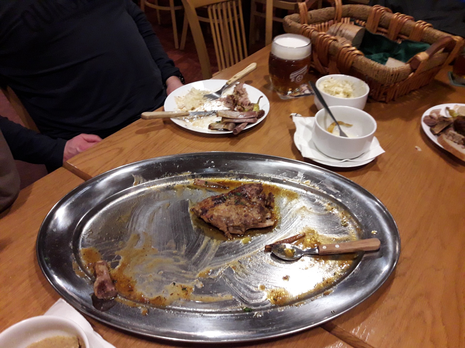 Žebírka voňavý - to taky nejde popsat, měkoučký - to taky... no, jako dort prošpikovanej kostma... křen, hořčice, beraní rohy, chleba - ten byl jen normálně dobrej, plzeň výborná ...no a ta omáčka okolo ...měli jsme to pěkně ! vylízaný ( viz.foto).